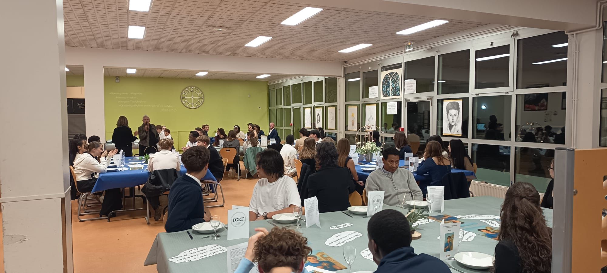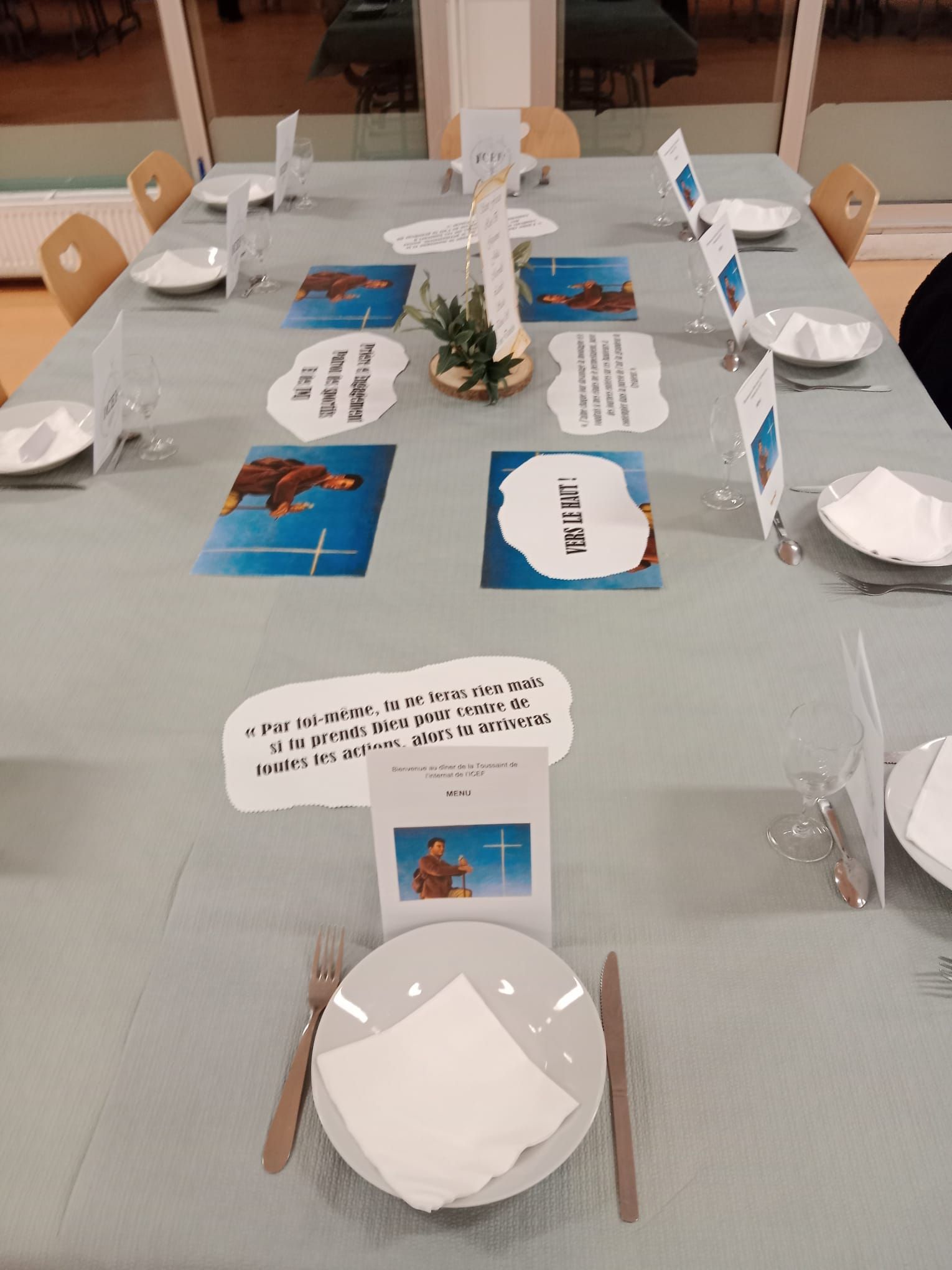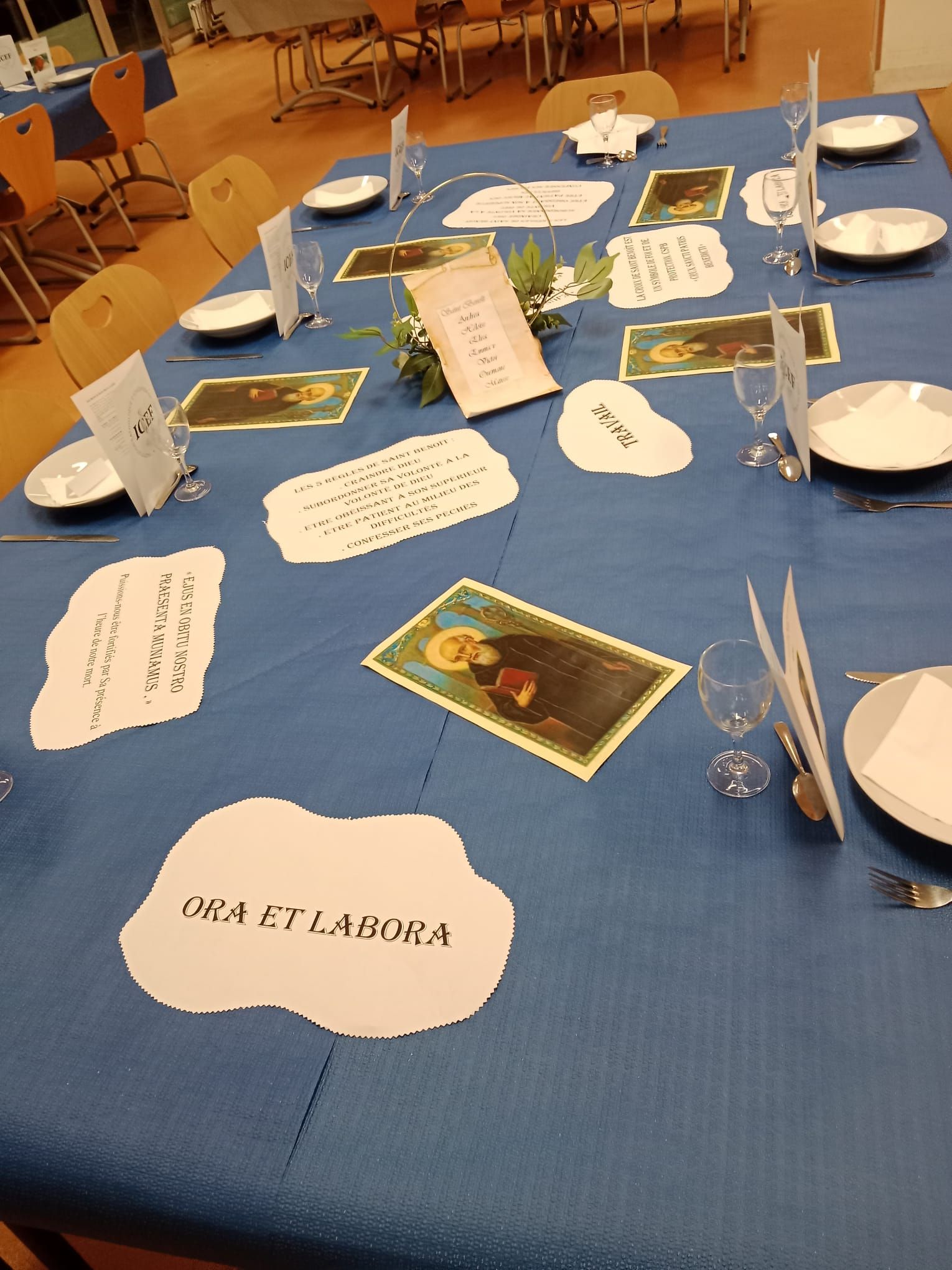 Servi à table dans une ambiance élégante et festive, ce repas a mis à l’honneur les saints choisis cette année, symboles de jeunesse et de famille : Saint Jean-Paul II, Sainte Joséphine Bakhita, Saint Pier Giorgio Frassati, Saint Carlo Acutis, ainsi que les noms des Saints qui représentent nos internats : Saint Benoît et Sainte Marthe.